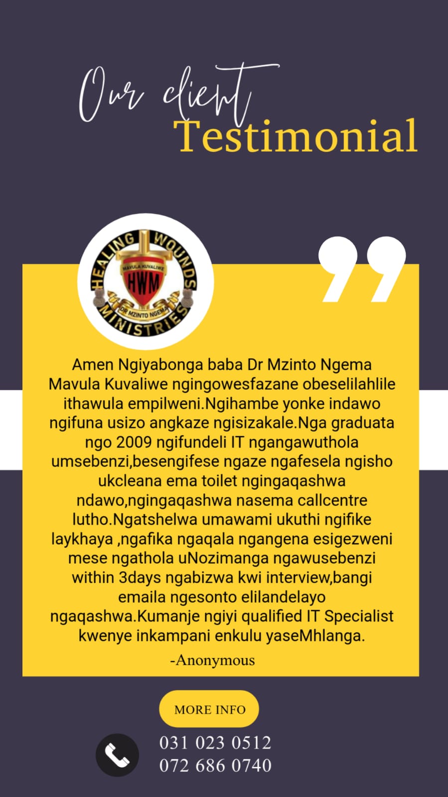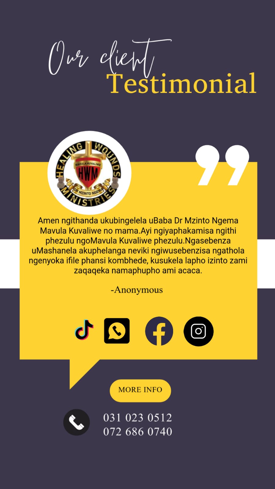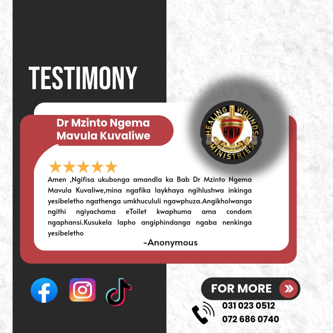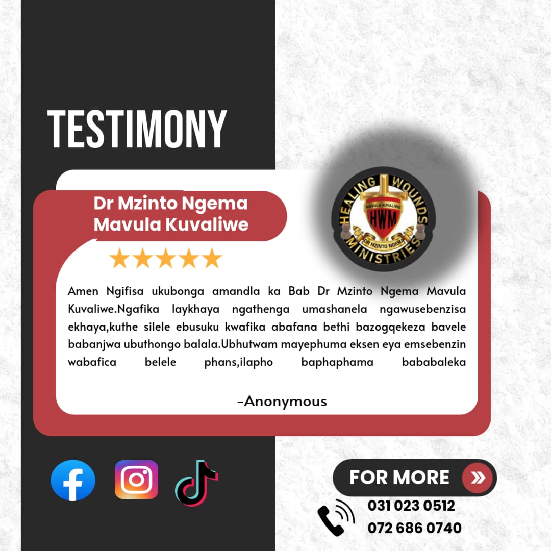 Dr Mzinto Ngema Mavula is the founder and director of Healing Wounds Ministries. He specializes in spiritual healing, spiritual guidance, business advice, relationship coaching and unlocking finances.